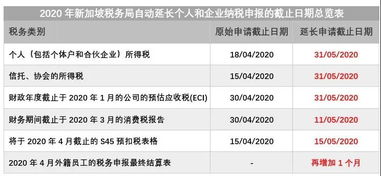 2020年4月4日,新加坡稅務局(IRAS)根據COVID-19情況的最新措施,作為對納稅人的支持,新加坡稅務局(IRAS)自動延長個人和企業納稅申報的截止日期如下: